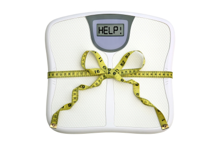 A scale with a tape measure wrapped around it tied in a bow. The display window says HELP! White background. Dieting concept.